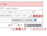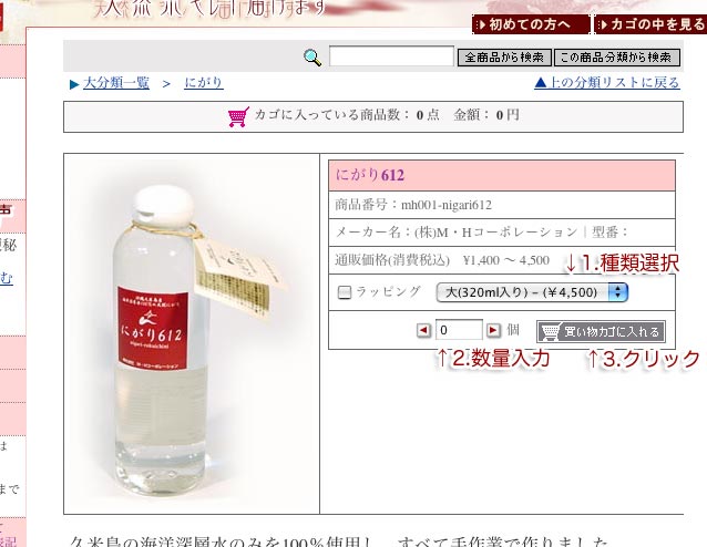 商品情報ページからご希望の商品を選択し、大きさなど種類がある場合はご希望のサイズも選択して、必要数を入力した後 ボタンを押してください。