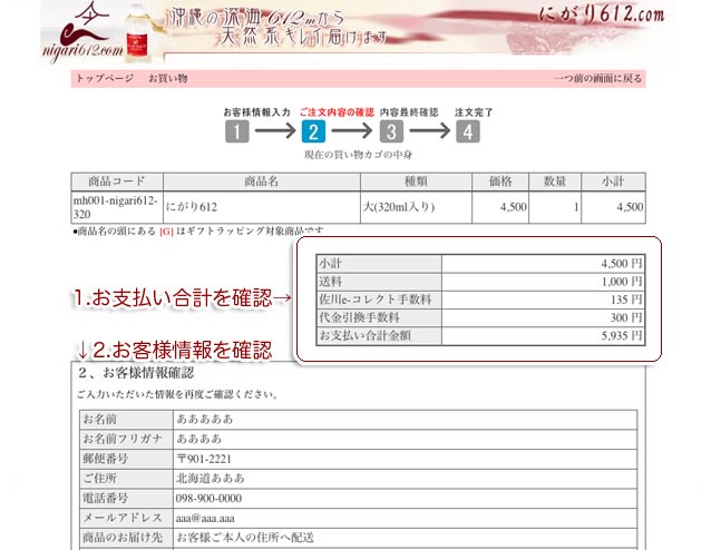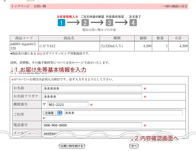 引き続き注文をする為には『ご注文画面へすすむ』ボタンをクリックし、2へ進みます。