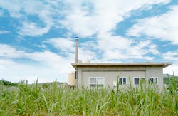 | さとうきび畑の中に建つ久米島工場 |