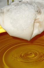 | にがりを貯蔵するタンクの蓋に使用している布には大粒の結晶がビッシリ! |